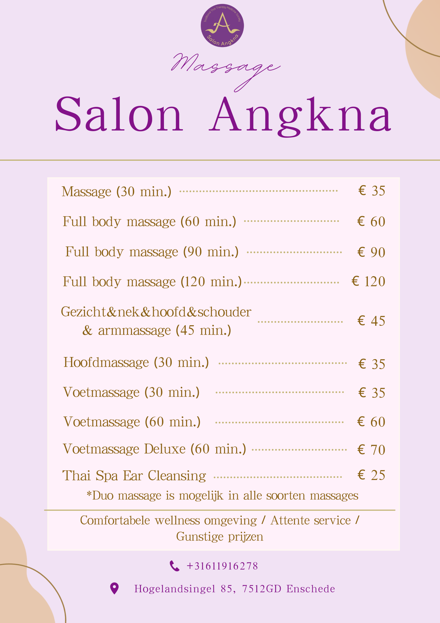 Tarieven Ontdek onze voordelige tarieven in de prijslijst voor ontspannende massagebehandelingen en Head Spa! 🌸 🌸
